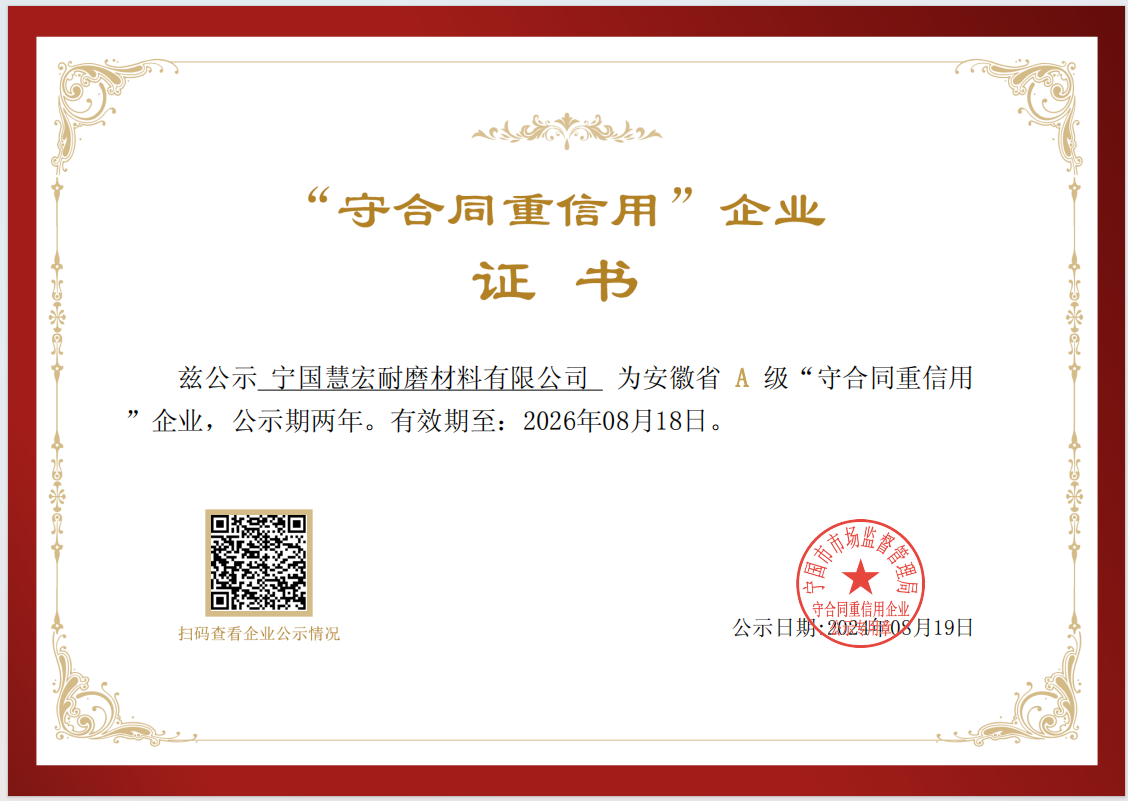 可靠的設(shè)備,才能長久穩(wěn)定運行全面推行ISO9001;2000版質(zhì)量管理體系標準,秉承“科學管理、精心制造、優(yōu)質(zhì)服務(wù)、追求卓越”的質(zhì)量方針,不斷打造高端耐磨材料產(chǎn)品。